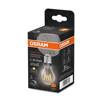 | Manufacturer Name | Vintage 1906 LED CLASSIC A,B,P SLIM FILAMENT DIMMABLE 4.8W 827 Clear E | |