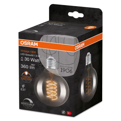Osram Vintage 1906 LED E27 Globe Filament Smokey 80mm 7.8W 360lm - 818 Extra Warm White | Dimmable