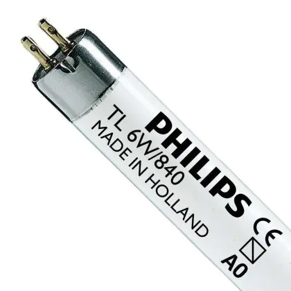 Philips TL Mini 80 Colours are fluorescent tubes of 16 mm in diameter. These tubes are very thin and very small. The lamps are specifically designed for areas where space is limited such as emergency lighting, furniture, etc. Philips TL Mini Super 80 6W 840 - 21cm have a G5 base type and measure 21 cm.