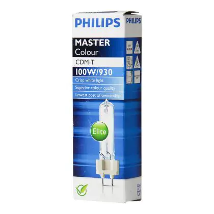 The Philips CDM-T Elite 100W 930 G12 lamps emit a warm white light (3000K) to allow you to create an appealing ambience. The colour rendering index is also excellent, more than 90-100Ra.